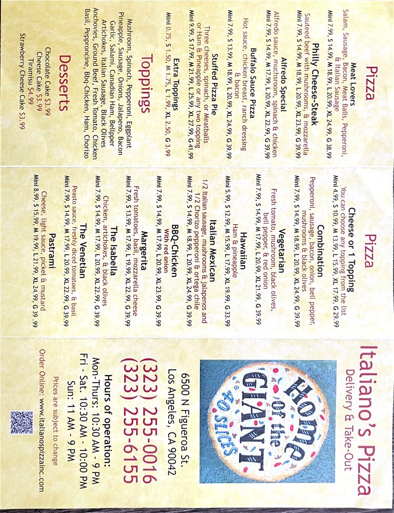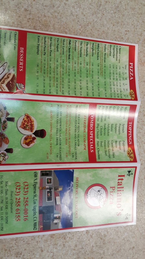 Italiano’s Pizza, located at 6500 N Figueroa St in Los Angeles, offers a variety of delicious pizza options with many vegetarian choices. The restaurant provides delivery, takeout, and even accepts reservations. With wheelchair accessibility and a family-friendly atmosphere, Italiano's is suitable for groups and kids. Customers appreciate the friendly service and fast preparation of their food. The location has a true neighborhood atmosphere, making it a great spot to enjoy a tasty meal. If you're in the mood for a unique dining experience, be sure to try out Italiano’s Pizza for their tasty food and welcoming environment.